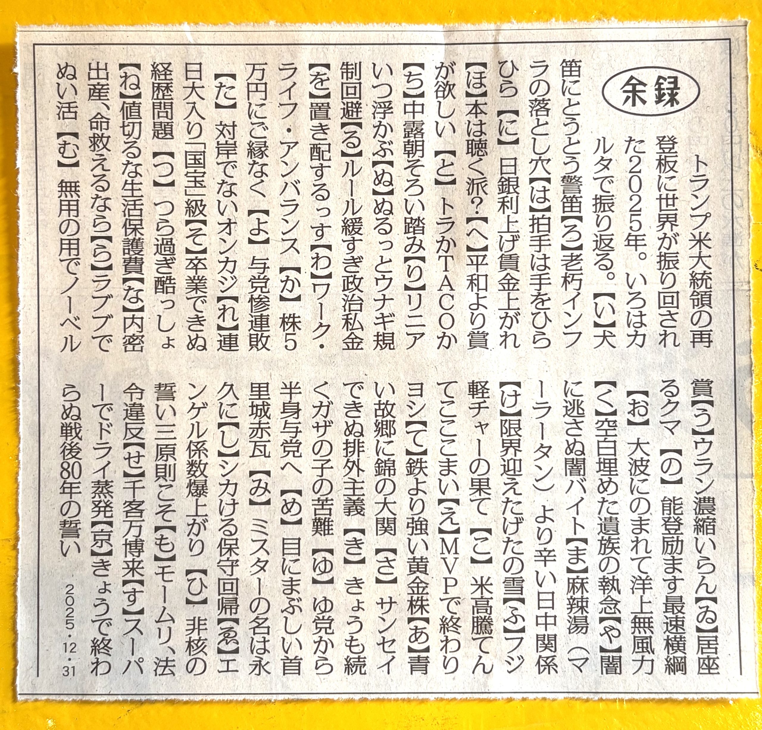 『トランプ米大統領の再登板に世界が振り回された2025年。いろはカルタで振り返る。【い】犬笛にとうとう警笛【ろ】老朽インフラの落とし穴【は】拍手は手をひらひら【に】日銀利上げ賃金上がれ【ほ】本は聴く派?【へ】平和より賞が欲しい【と】トラかTACOか【ち】中露朝そろい踏み【り】リニアいつ浮かぶ【ぬ】ぬるっとウナギ規制回避【る】ルール緩すぎ政治私金【を】置き配するっす【わ】ワーク・ライフ・アンバランス【か】株5万円にご縁なく【よ】与党惨連敗【た】対岸でないオンカジ【れ】連日大入り「国宝」級【そ】卒業できぬ経歴問題【つ】つら過ぎ酷っしょ【ね】値切るな生活保護費【な】内密出産、命救えるなら【ら】ラブブでぬい活【む】無用の用でノーベル賞【う】ウラン濃縮いらん【ゐ】居座るクマ【の】能登励ます最速横綱【お】大波にのまれて洋上無風力【く】空白埋めた遺族の執念【や】闇に逃さぬ闇バイト【ま】麻辣湯(マーラータン)より辛い日中関係【け】限界迎えたげたの雪【ふ】フジ軽チャーの果て【こ】米高騰てんてこここまい【え】MVPで終わりヨシ【て】鉄より強い黄金株【あ】青い故郷に錦の大関【さ】サンセイできぬ排外主義【き】きょうも続くガザの子の苦難【ゆ】ゆ党から半身与党へ【め】目にまぶしい首里城赤瓦【み】ミスターの名は永久に【し】シカける保守回帰【ゑ】エンゲル係数爆上がり【ひ】非核の誓い三原則こそ【も】モームリ、法令違反【せ】千客万博来【す】スーパーでドライ蒸発【京】きょうで終わらぬ戦後80年の誓い』(引用元):毎年、いくつかピンと来ないカルタがあります。皆様も「?」あらば検索を。昨年の「余録」などはこちら