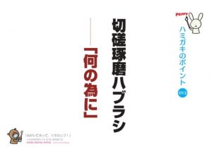 1)よく歯を磨く、すぐ磨く、じっくり磨く。2)リスキーな食べ物・食べ方を避ける(傾向にある)。3)信頼のおける、自分より上手な歯科医師をかかりつけとする。ここでは小生の歯磨きを例に「ハイシャのハミガキ」をご紹介します。